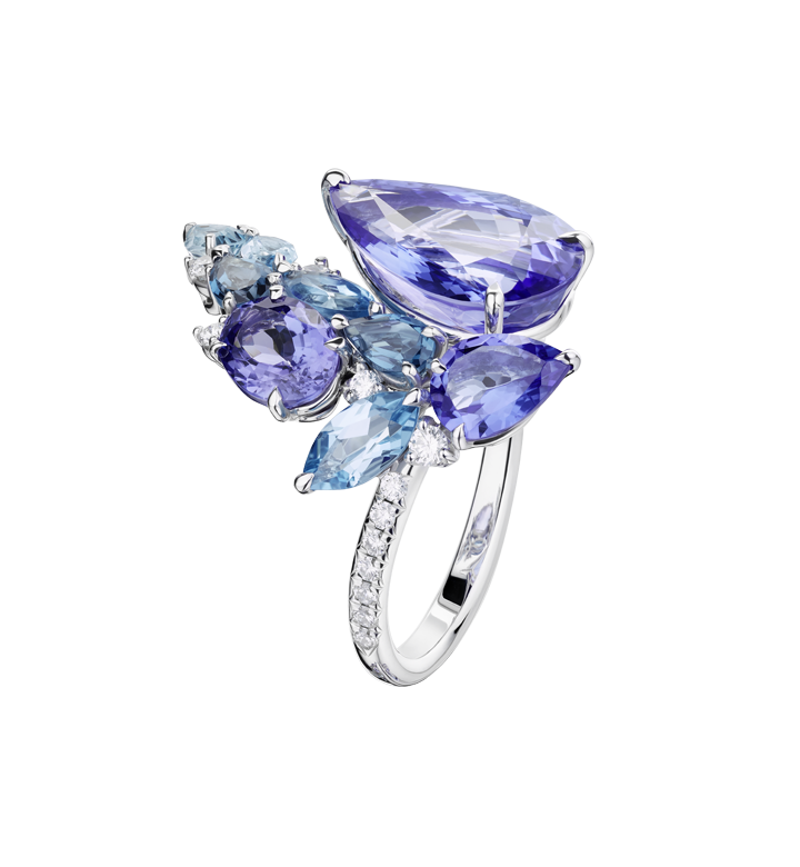 Bague “Tivoli” en or blanc 18kt sertie d’une tanzanite taille poire 5.30 cts, 2 tanzanites 1.5 cts., 6 topazes 1.61 cts., 5 diamants 0.09 ct et de 27 diamants 0.15 ct.