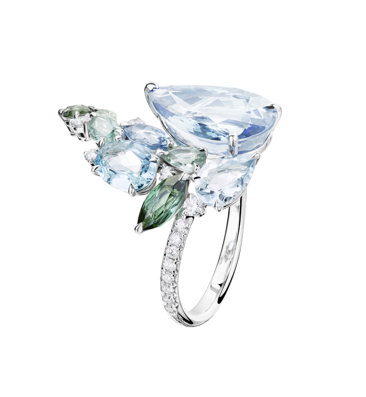 Bague “Tivoli” en or blanc 18kt sertie d’une aigue-marine taille ovale 4.58 cts, 4 tourmalines 0.91 ct, 2 aigue-marines 0.75 ct, 2 béryls 0.71 ct. et de 32 diamants 0.27 ct.