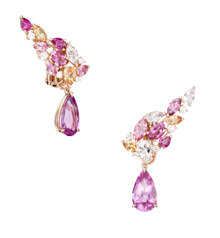 Boucles d’oreilles “Tivoli” en or rose 18kt serties de 2 rubellites taille poire 4.49 cts, 4 morganites 1.02 cts, 7 tourmalines roses 1.59 cts, 4 spessartites 1.17 cts, 3 spinelles 0.55 ct et de 10 diamants 0.28 ct.