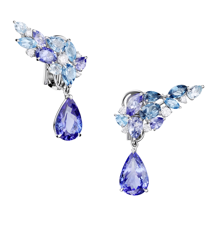 Boucles d’oreilles “Tivoli” en or blanc 18kt sertie de 2 tanzanites taille poire 5.079 cts, 12 topazes 3.07 cts, 6 tanzanites 1.71 cts et de 10 diamants 0.28 ct.