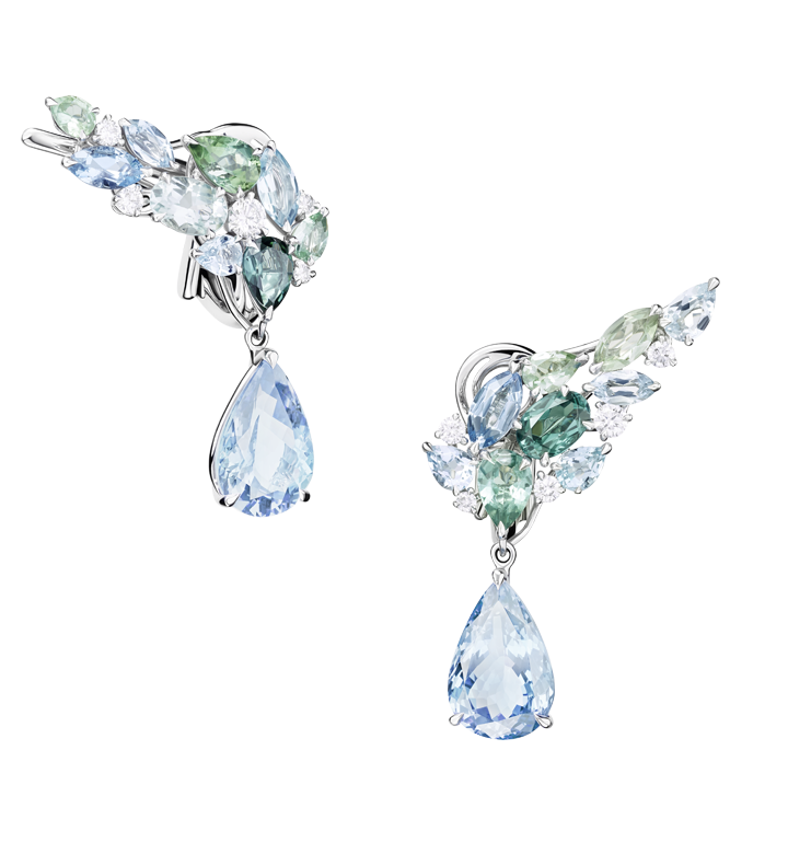 Boucles d’oreilles “Tivoli” en or blanc 18kt serties de 2 aigue-marines taille ovale 4.75 cts, 8 tourmalines 2.49 cts, 8 aigue-marines 1.40 cts, 2 béryls 0.38 ct et de 10 diamants 0.33 ct.