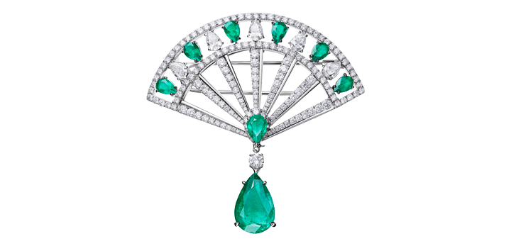 Brooch “Fan’tasia” in 18kt white gold set with one Colombian pear-shaped emerald 7.70 cts, 7 pear-shaped emeralds 2.78 cts, 5 pear-shaped diamonds 1.57 cts and 164 diamonds 3.78 cts