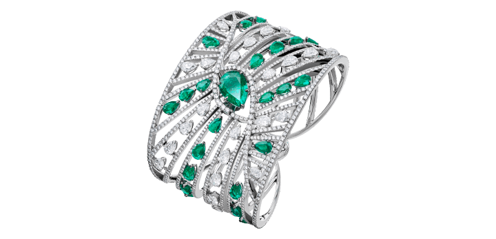 Bracelet “Fan’tasia” in 18kt white gold set with one Colombian pear-shaped emerald 3.68 cts, 24 pear-shaped emeralds 8.41 cts, 26 pear-shaped diamonds 7.50 cts and 1175 diamonds 13.50 cts.