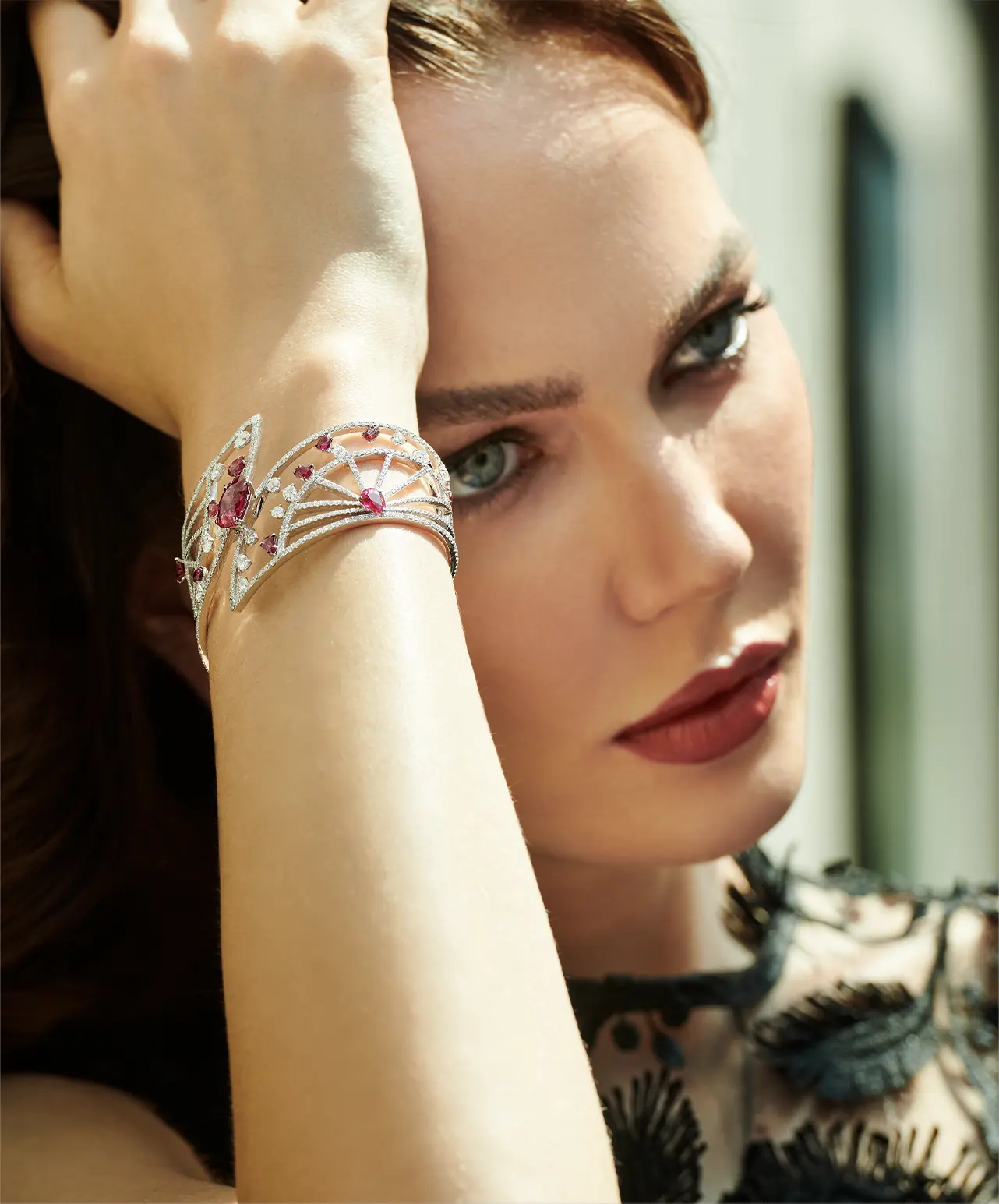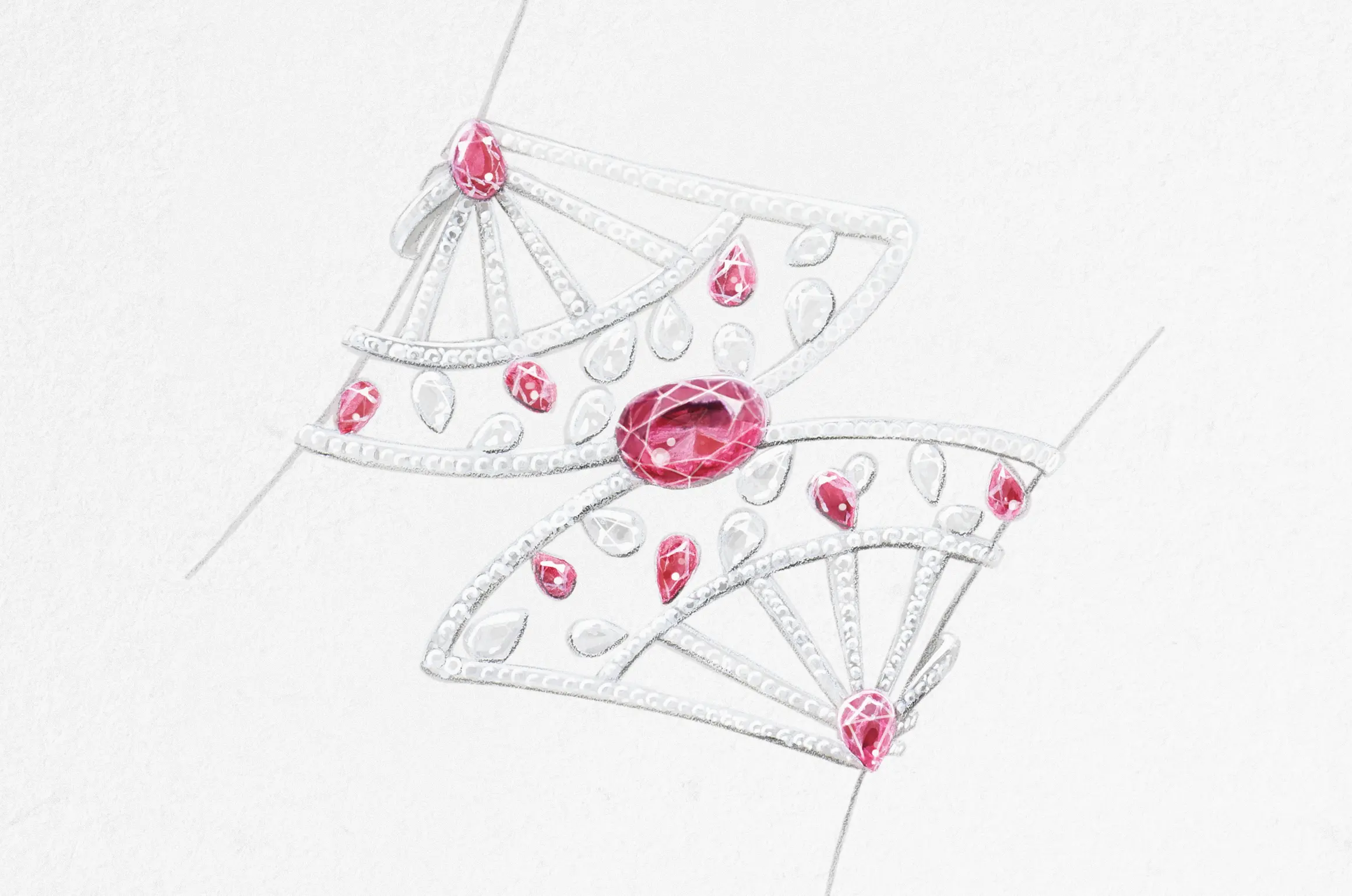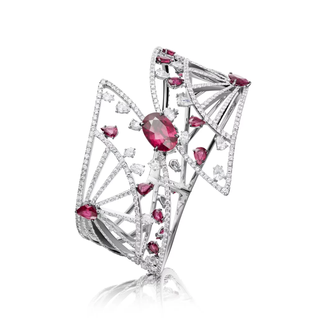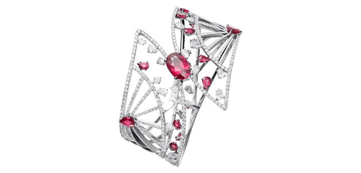 Bracelet “Fan’tasia” in 18kt white gold set with one oval cut ruby 4.16 cts, 16 pear-shaped rubies 4.78 cts, 28 pear-shaped diamonds 3.38 cts and 661 diamonds 7.16 cts.