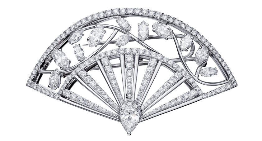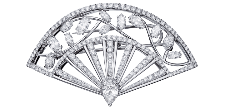 Brooch “Fan’tasia” in 18kt white gold set with one pear-shaped diamond 0.70 ct, 12 marquise cut diamonds 2.21 cts and 180 diamonds 2.34 cts.