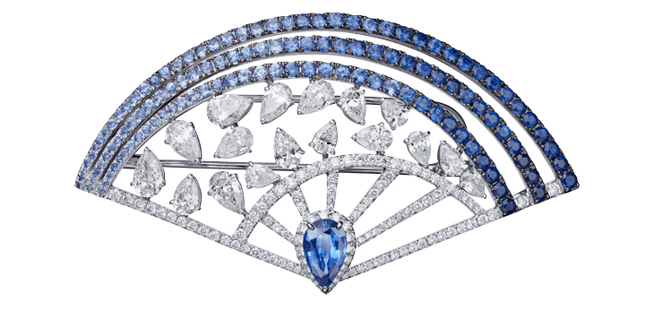 the daintiest of minute contours, Fan’tasia graces its wearer with subtle elegance. Sparkling on their white-gold fan, diamonds and sapphires concur in a dialogue of exquisite hues and shapes.