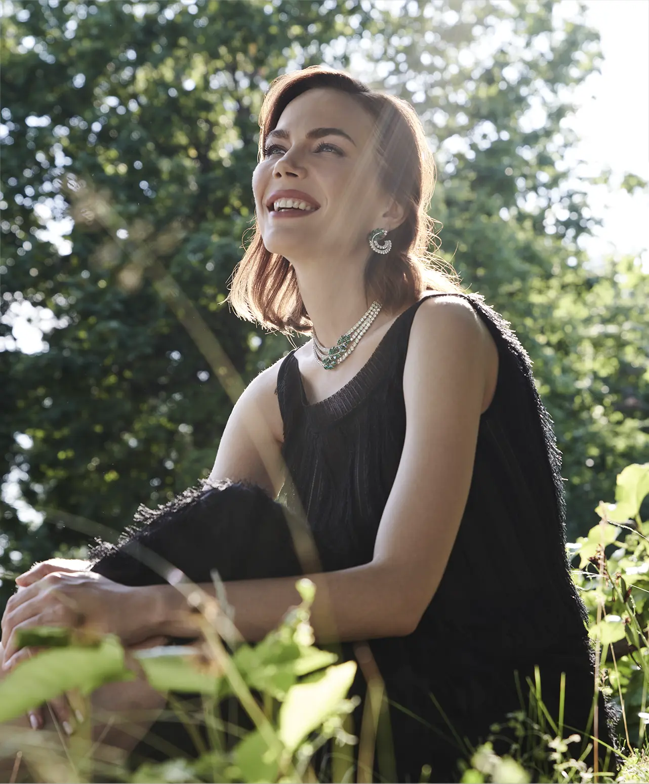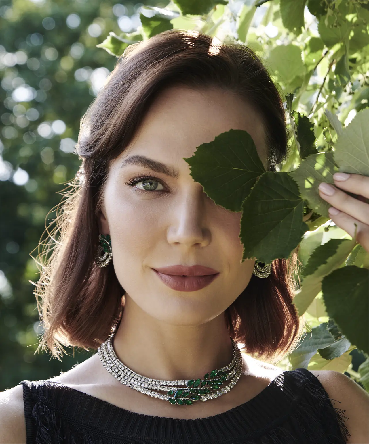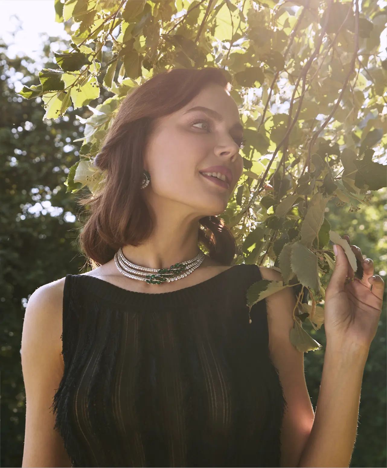 Three rows of round diamonds taper gracefully around the neck before merging with the emerald leaves. Playing with contrasts of structure and fluidity, solid lines of pave enhance the shivering movement of the prong-set diamonds.